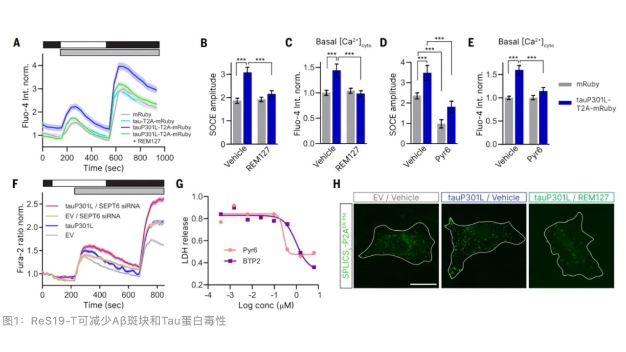 本文发现了一类具有潜在治疗AD的蛋白ReS19-T,可通过恢复SEPT6肌动蛋白结构稳定性,减少内质网膜和细胞质膜接触,抑制SOCC通道,减少钙离子内流,并能显著减少AD模型小鼠Aβ斑块沉积和Tau蛋白异常积聚。