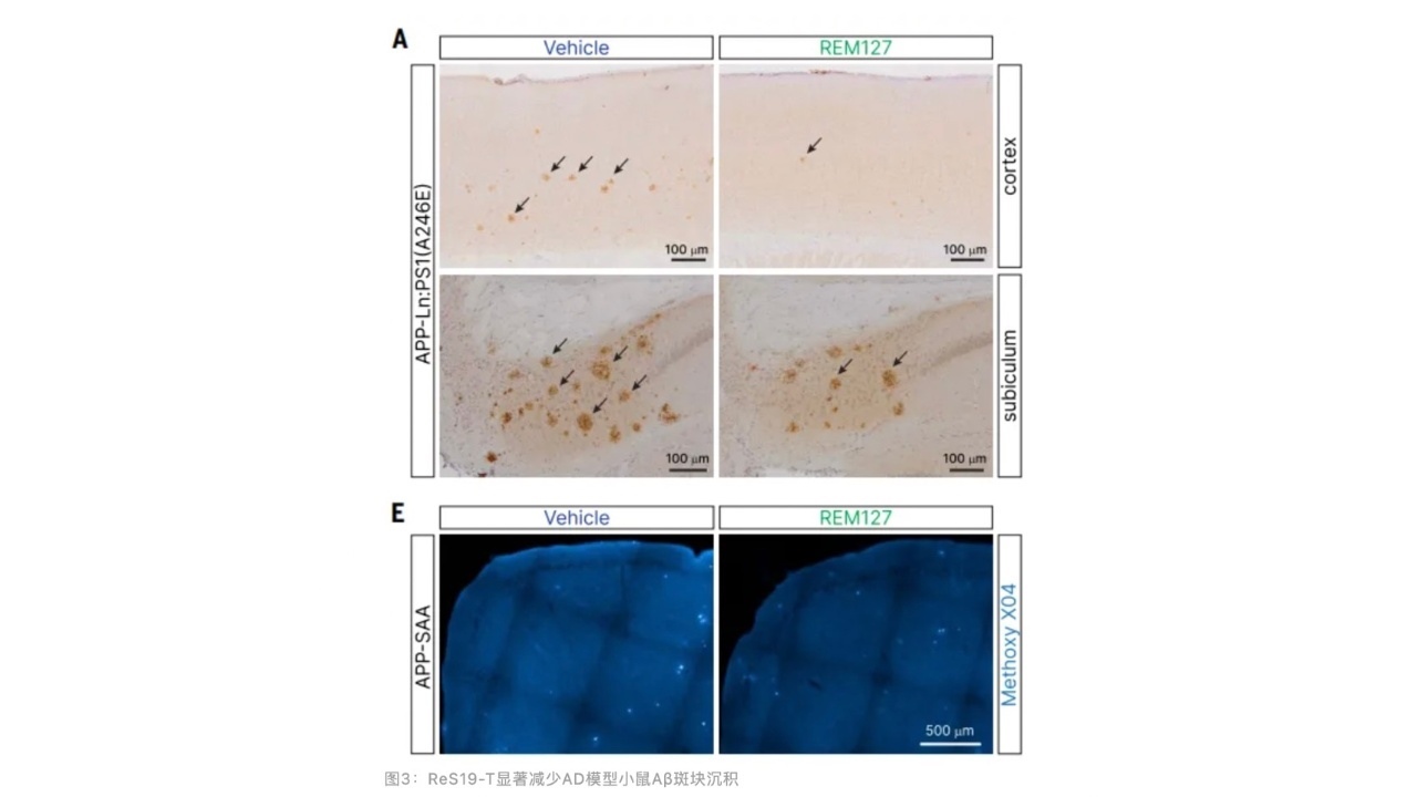 TauP301S转基因小鼠(Tau蛋白突变)和APP-Ln模型小鼠海马脑区存在严重的长时程增强障碍,7天口服REM127可明显缓解上述突触可塑性障碍,并能改善空间学习记忆障碍。接受3个月的REM127可减少50%的APP-Ln模型小鼠皮层和海马Aβ斑块沉积,也能减少APP-SAA(另外一种AD模型小鼠)小鼠海马的Aβ斑块沉积和Tau蛋白聚集,也能降低磷酸化Tau蛋白水平,这些结果表明REM127可显著改善AD模型小鼠的核心病理事件。
