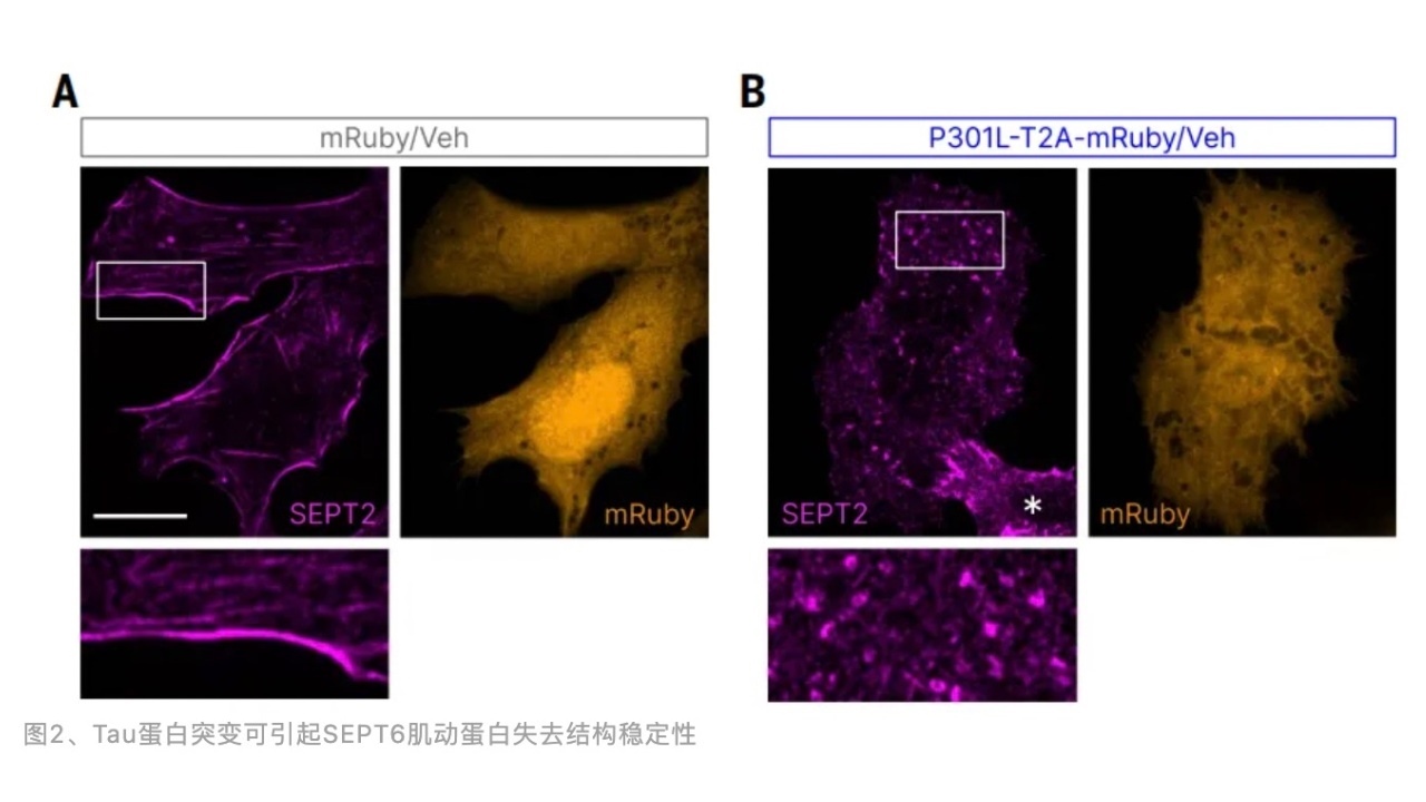 离体细胞实验表明Tau蛋白突变可引起SEPT6肌动蛋白大面积的重构,失去结构稳定性,而REM127可显著恢复这种结构失稳。因此,Tau蛋白突变可引起SEPT6肌动蛋白结构失稳,增加内质网膜和细胞质膜接触位点面积,激活SOCC通道引起钙离子内流。
