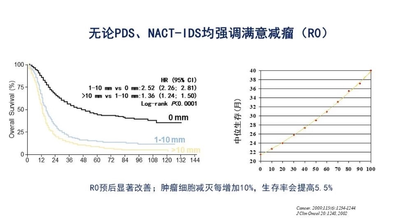 但是无论PDS/NACT+IDS均应强调R0。R0预后显著改善,肿瘤细胞减灭每增加10%,生存率会提高5.5%。