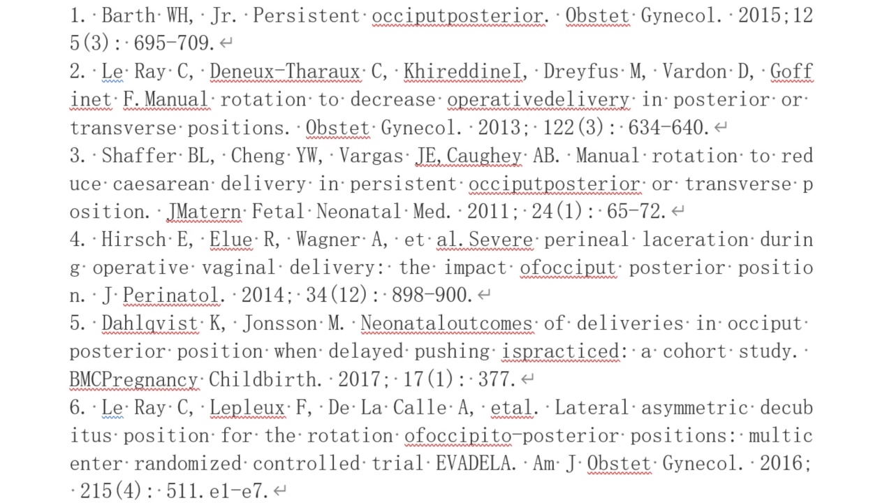 全手旋转胎头:加拿大妇产科医师协会(SOGC)描述了这种技术[17]。将所有四个手指置入阴道后穹窿,手掌置于枕骨,拇指置于一侧顶骨,宫缩时使胎头俯曲,沿较短的弧线旋转胎头至枕前位。