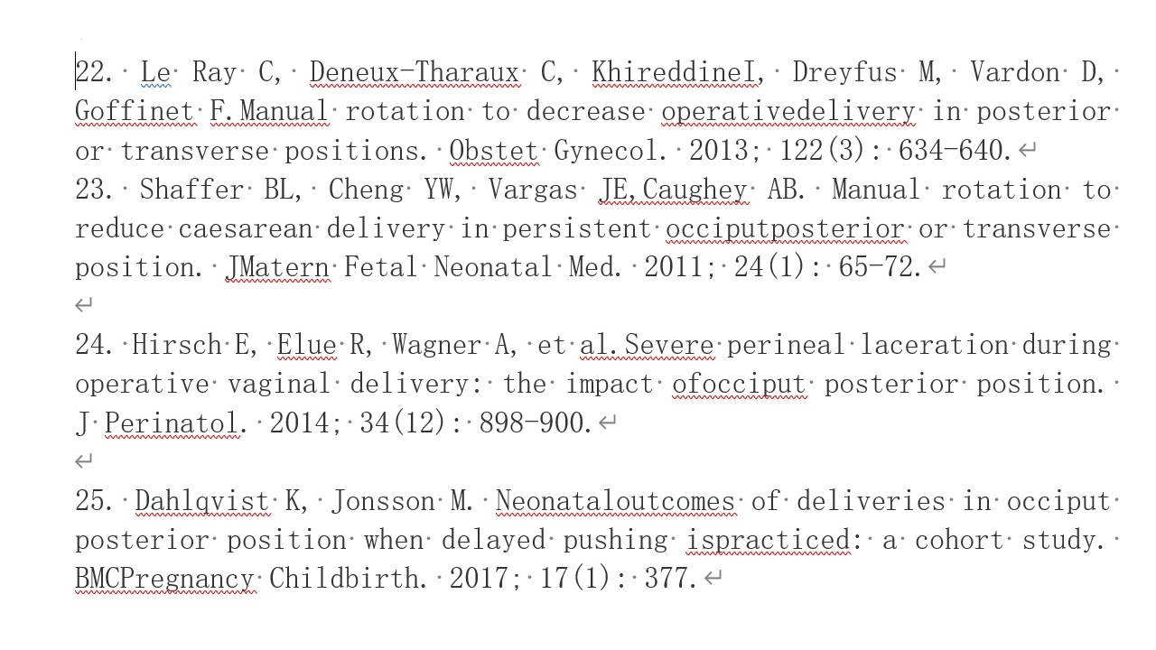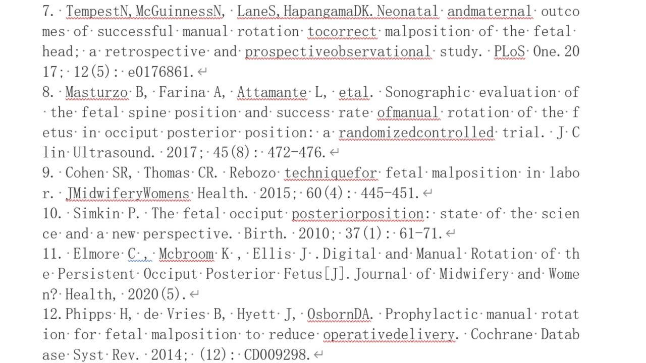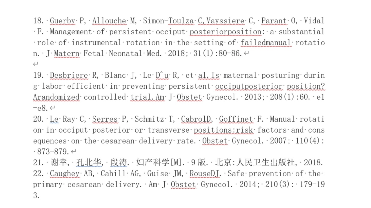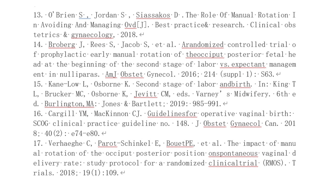 徒手旋转胎头技术可促进阴道分娩,降低剖宫产率。《妇产科学》第九版对持续性枕后位、枕横位第二产程的处理中描述了这项技术[21]。美国ACOG和SMFM将人工旋转胎头表述为“阴道手术分娩或剖宫产术前的合理考虑”[22]。此外,加拿大的专家报告说,“徒手旋转胎头”对孕妇或胎儿的风险几乎没有增加[16]。Varney助产学中也将徒手旋转胎头描述为一种合理的干预措施,可以降低枕后位分娩的并发症[15]。不过,仍需要更多的高质量研究来评估这项技术的使用时间和操作规范。