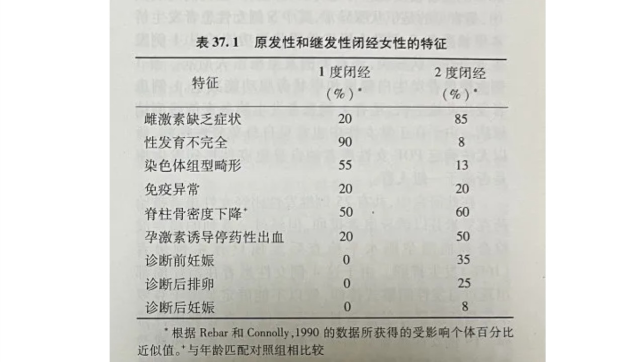 不仅如此还发现两种闭经女性的染色体组型畸形类型各不相同:继发性闭经女性患者通常多一个X染色体,而原发性闭经女性患者更容易发生全部或部分X染色体丢失。在与年龄匹配对照组进行的骨密度比较中,两个闭经女性患者组中都至少有一半女性患者骨密度降低。约有一半的继发性闭经女性患者会发生外源性孕激素停药性出血,而只有20%的原发性闭经女性患者会发生孕激素停药性出血。