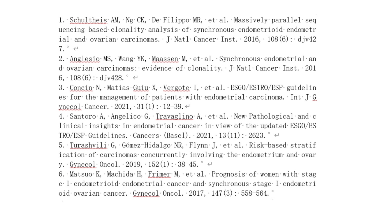 根据这些标准,提示双原发性肿瘤的特征包括:①肿瘤的组织学不同;②子宫内膜样癌没有侵犯肌层或仅浅表肌层受累;③存在子宫内膜不典型增生;④缺乏淋巴血管间隙浸润(LymphaticVascularSpaceInvasion,LVSI),仅单侧卵巢受累,且卵巢实质受累;⑤无LVSI;⑥卵巢和子宫内膜肿瘤无LVSI播散;⑦细胞拷贝数、分子遗传或染色体异常不一致。合并同步子宫内膜样癌和无同步子宫内膜样癌的卵巢癌患者,其生存率没有显著差异。与单纯的卵巢子宫内膜样癌患者相比,合并子宫内膜样癌的患者更容易出现MLH1、PMS2和PTEN缺陷。