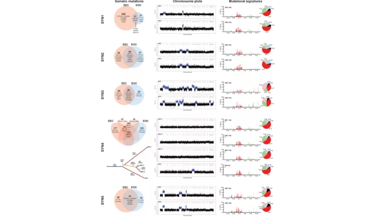 图1.双原发性子宫内膜癌的克隆及突变谱一致。