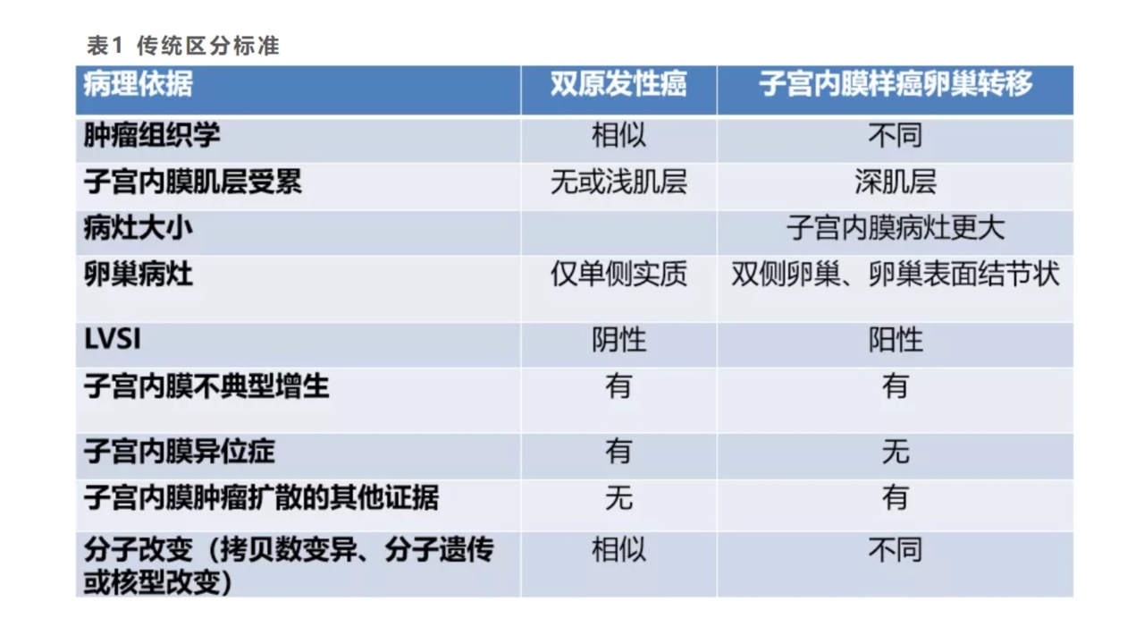 子宫内膜合并卵巢子宫内膜样癌的分期存在三种情况,若诊断为独立的子宫内膜样癌及卵巢原发肿瘤,则各自分期为IA;如果诊断为转移性癌,按照子宫内膜癌分期,分为IIIA分期;按照卵巢癌分期,分为IIA分期。不同分期患者,其治疗方法不同,预后也不相同。那么,如何区分是双原发性癌还是转移性癌?1985年,Ulbright和Roth提出了在此类病例中区分转移性癌(MetastaticCancer,MC)和双原发性癌(DoublePrimaryCancer,DPC)的标准。1998年,Scully和Young进一步提出了更详细的诊断标准,并沿用至今。