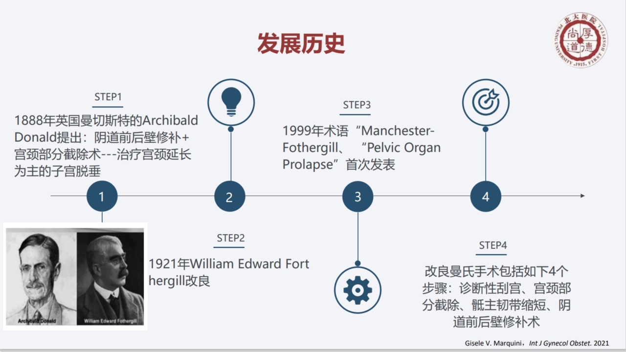 曼市手术最初在1888年英国曼彻斯特由ArchibaldDonald医生提出并实施。其主要原理是切除宫颈,并将子宫骶骨韧带张力性交叉悬吊在子宫峡部前壁。其优点在于在保留子宫的同时利用子宫骶骨韧带的张力向后拉伸起到悬吊子宫的作用。