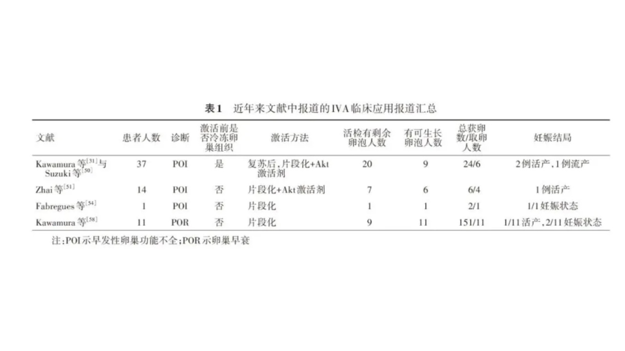 POI患者因卵泡衰竭导致排卵障碍,因而很少有机会妊娠,只有5%~10%的患者有可能出现卵泡生长甚至排卵[48]。研究显示,POI患者随着病情的进展其妊娠概率会逐渐下降,最后可能仅有1.5%的妊娠率[49]。POI患者体内虽残存一定数量原始卵泡,但其对促性腺激素无反应能力,无法使用常规IVF-ET治疗。行卵巢组织冷冻保存的肿瘤患者因卵巢冷冻,移植等因素损害,其内卵泡数量下降,同样需寻求新的方法提高卵泡利用率。IVA技术通过激活原始卵泡而使卵巢储备严重不足的患者有排卵可能,如使POI患者以及行生育力保存的肿瘤患者卵巢内的卵泡得到更充分利用。