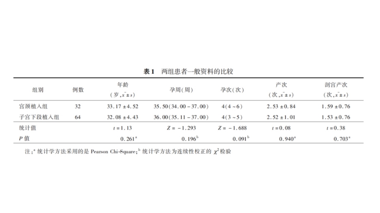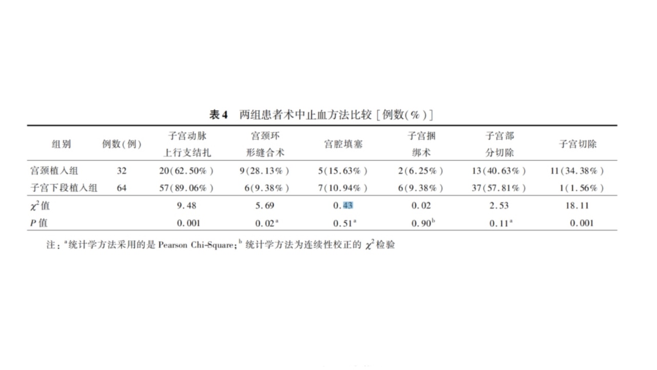 (2)子宫下段植入组中57例(89.06%)采取子宫血管结扎进行止血,高于宫颈植入组20例(62.5%),c2=9.48,P小于0.05;宫颈植入组宫颈环形缝合术28.13%(9/32)和子宫切除率达34.38%(11/32),高于子宫下段植入组的9.38%(6/64)和1.56%(1/64),c2=5.69和18.11,P小于0.05。