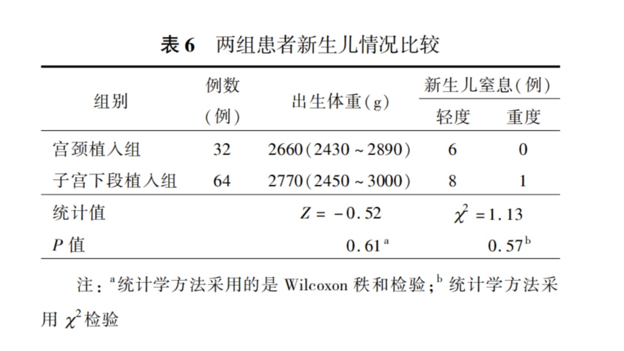 两组孕妇新生儿一般情况主要包括出生体重和窒息情况,两组间比较差异无统计学意义。见表6。