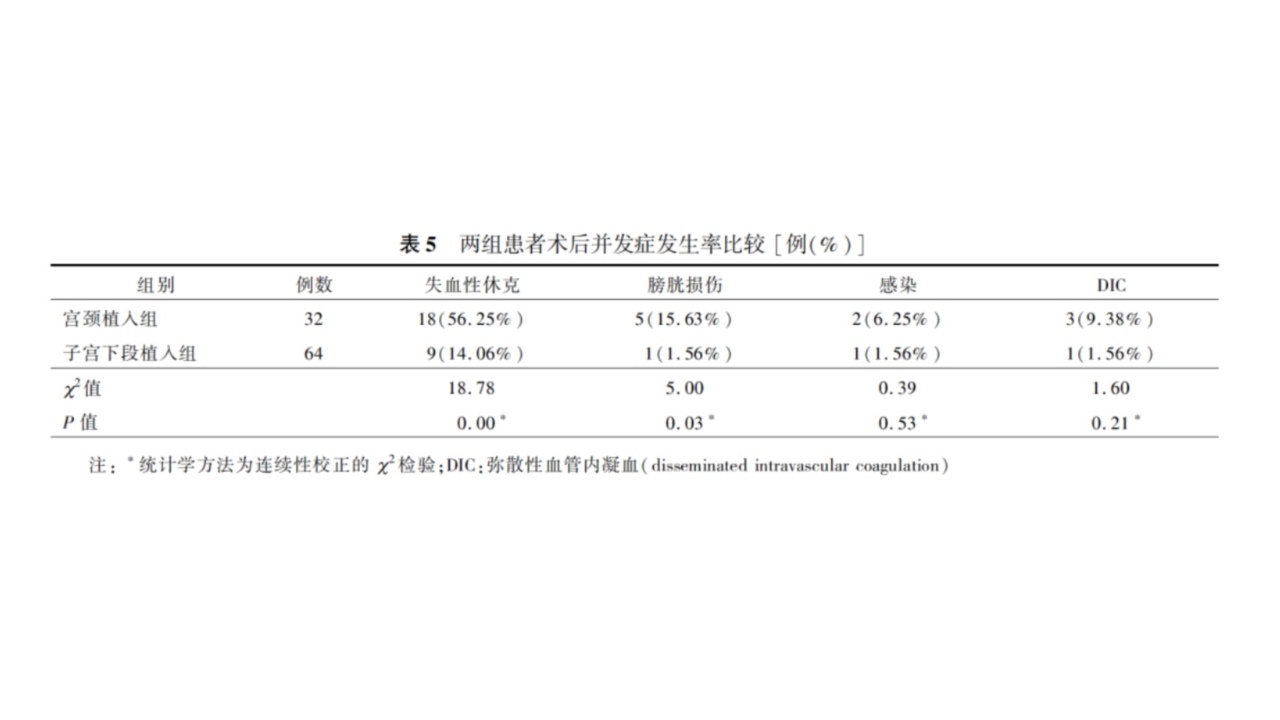 3例出现术后发热,发热时间为术后1~3d,体温最高38.2℃。术后阴道流血50ml~300ml。术后一周超声检查,子宫及附件未见异常。宫颈植入组失血性休克及膀胱损伤发生率分别为56.25%、15.63%,分别高于子宫下段植入组的14.06%和1.56%(P小于0.05),两组间感染及弥散性血管内凝血(disseminatedintravascularcoagulation,DIC)的发生率比较无显著差异,见表5。