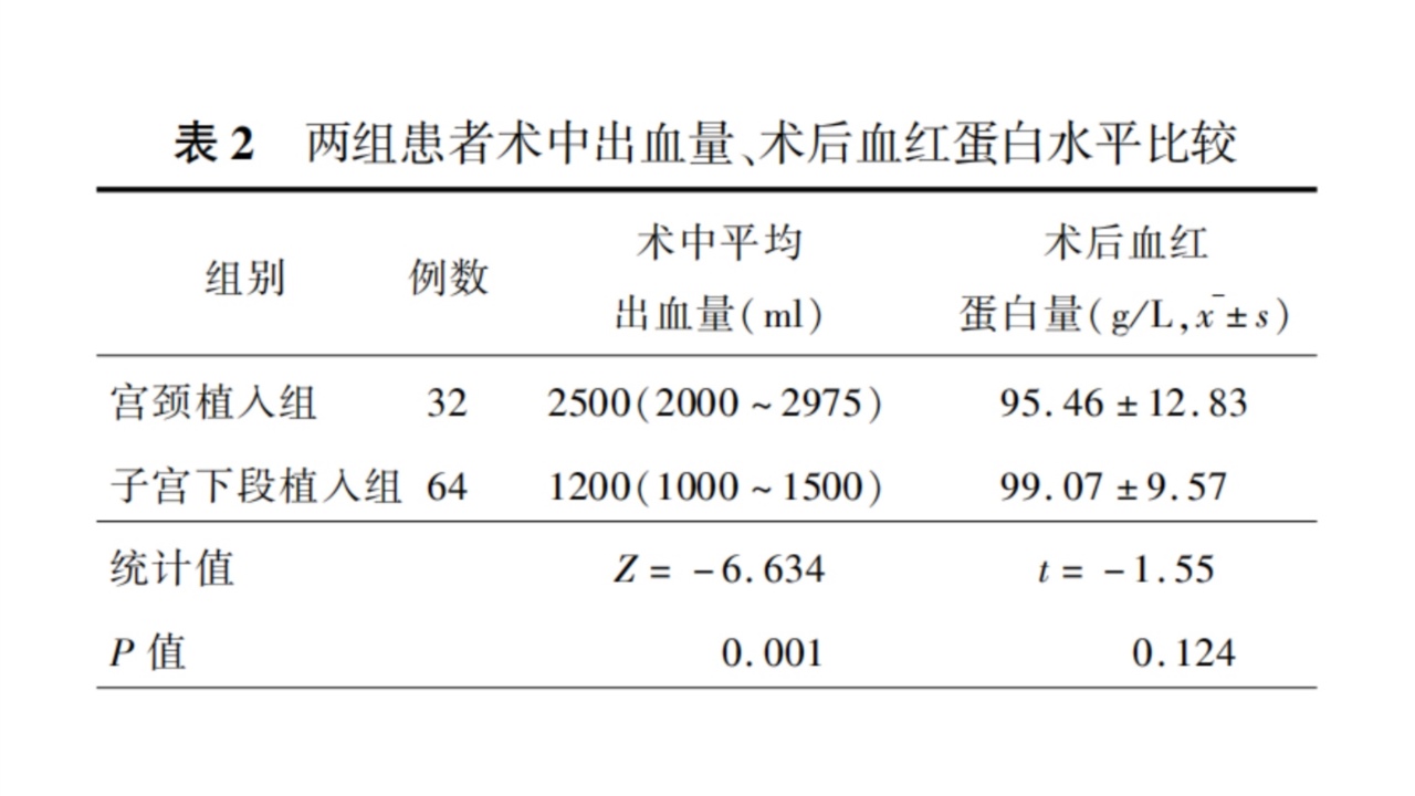 宫颈植入组术中出血量显著高于子宫下段植入组,两组术后血红蛋白量无显著差异。见表2。