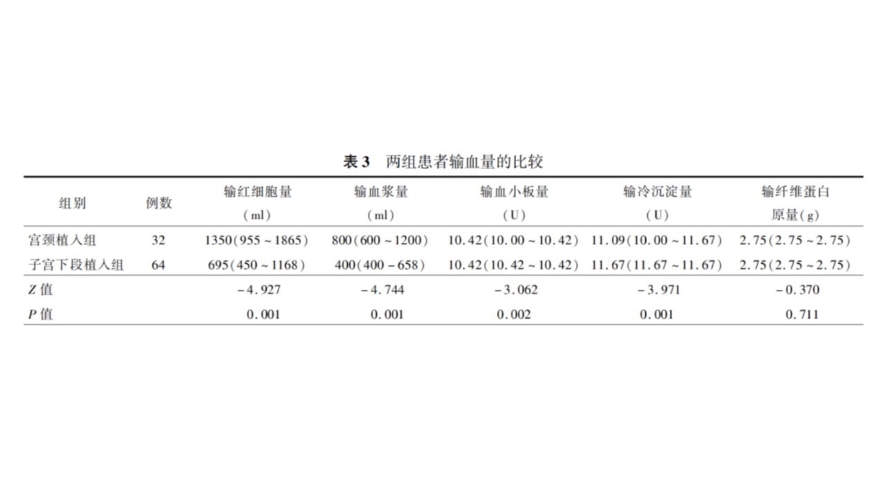 宫颈植入组输红细胞悬液、血浆、血小板及冷沉淀的量与子宫下段植入组比较差异均有统计学意义,两组患者输纤维蛋白原量则无明显差别。见表3。