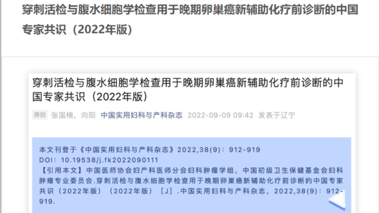 需要强调的是,在获得明确的病理诊断前不能实施NACT。然而,目前临床还存在以下问题,须引起重视:(1)确诊依据不足,无病理诊断,如仅凭超声、CT或MRI等影像学检查发现腹水和(或)附件包块、血清癌抗原125(cancerantigen125,CA125)升高就诊断卵巢癌并给予NACT。(2)诊断及治疗前评估不足或不规范,如对未经妇科肿瘤学专家评估的早期卵巢癌患者实施穿刺活检,甚至NACT。(3)诊断方法的选择和特异性存在一定争议,特别是腹水细胞学检查+血清CA125与癌胚抗原(carcinoembryonicantigen,CEA)比值(CA125/CEA)>25就诊断卵巢癌,须慎重选择,指南中也仅将其作为特殊情况下的诊断方法的替代选择,而不是首选或常规选择。