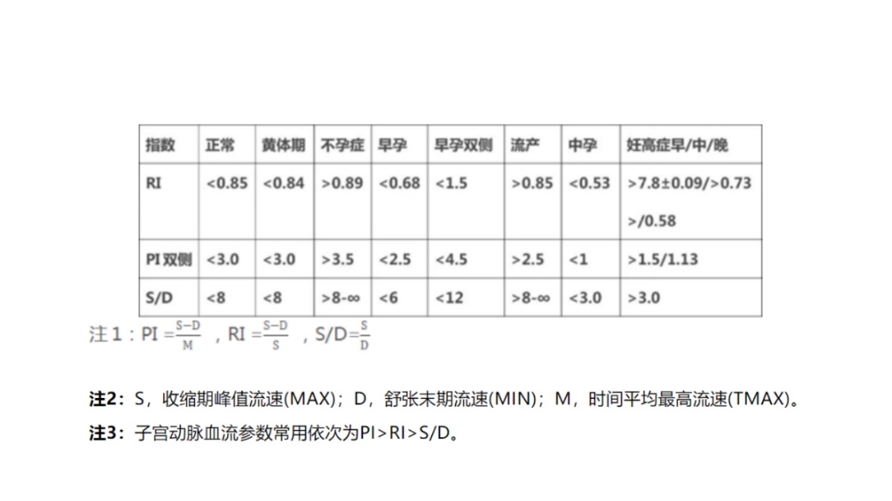 多普勒超声测量子宫螺旋小动脉搏动指数(PI)、阻力指数(RI)、收缩期指数(RSV)及子宫动脉血流的收缩期最大流速和舒张期末期流速的比值(S/D)。