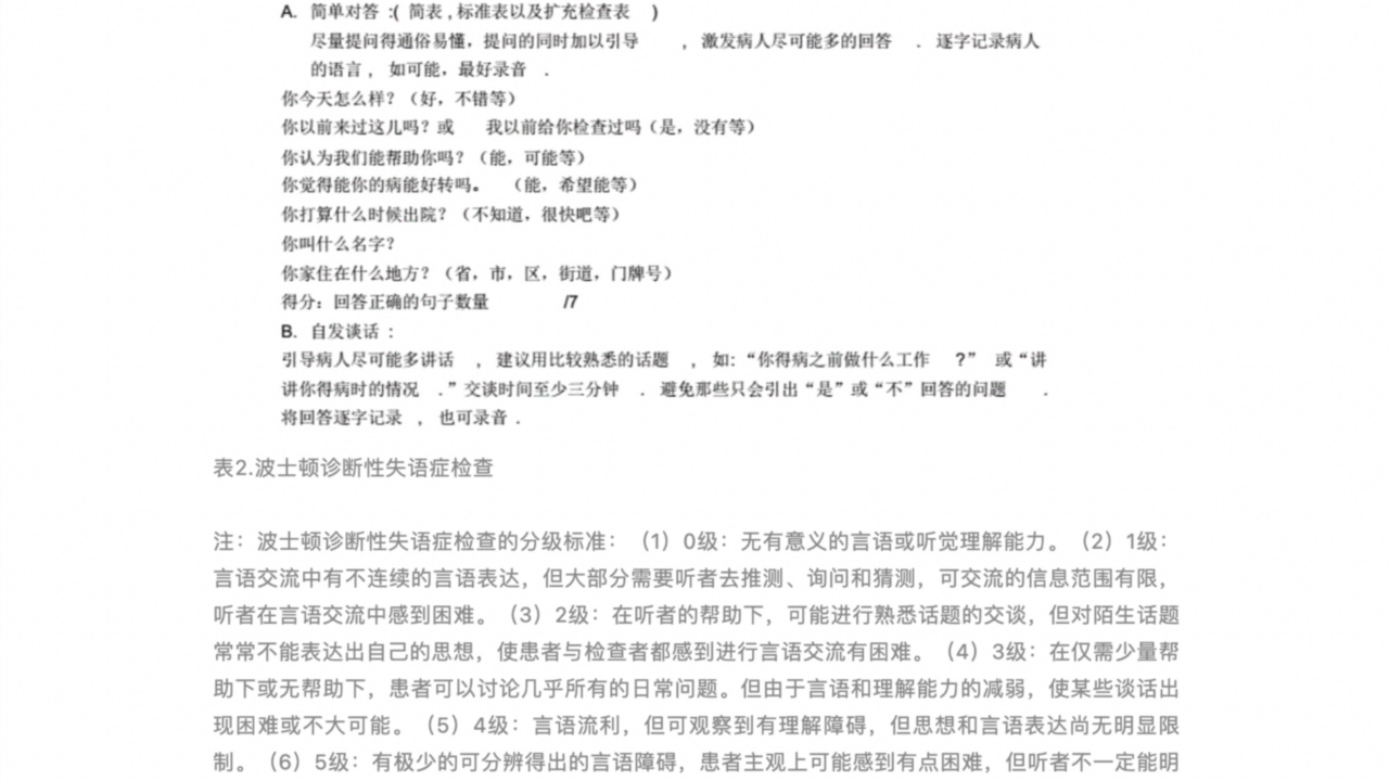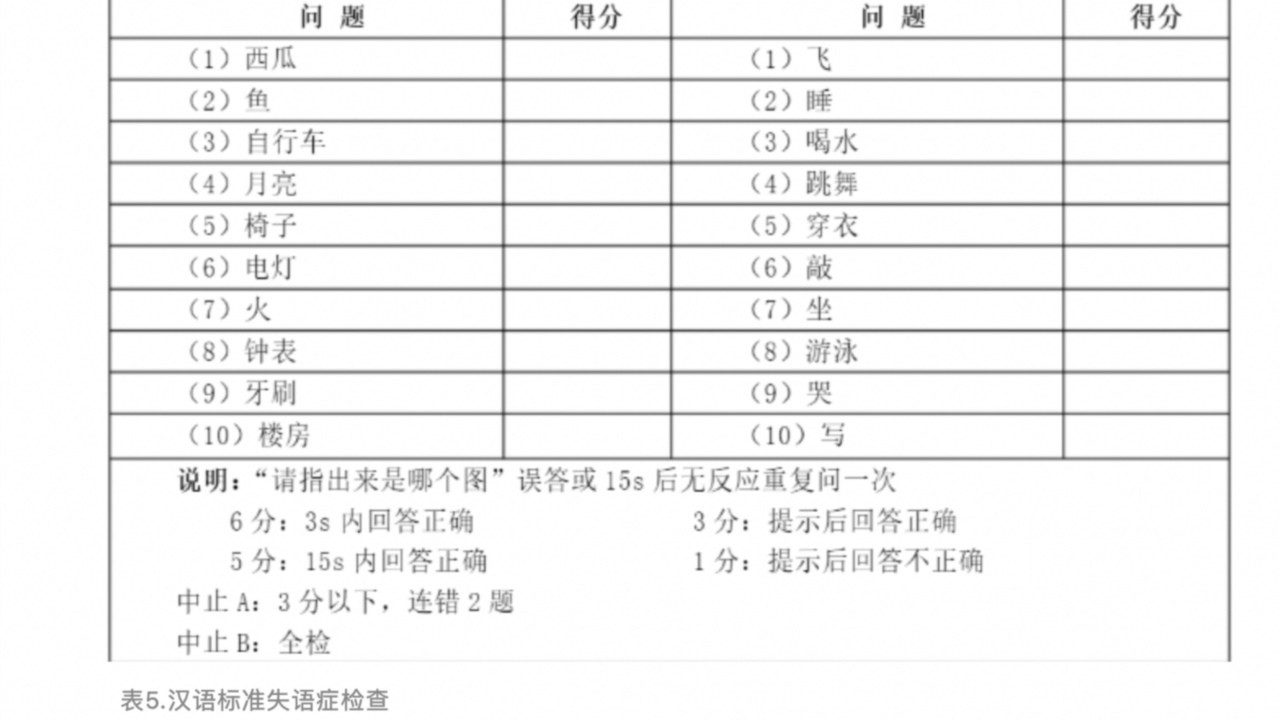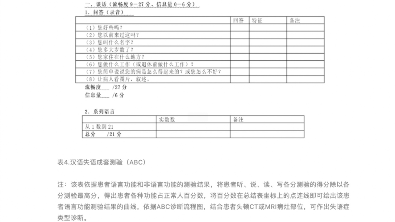 注:如患者是0-4.9分,属于完全性失语;如是5-10分,属于经皮质混合性失语;如果是8-10分属于经皮质感觉性失语。