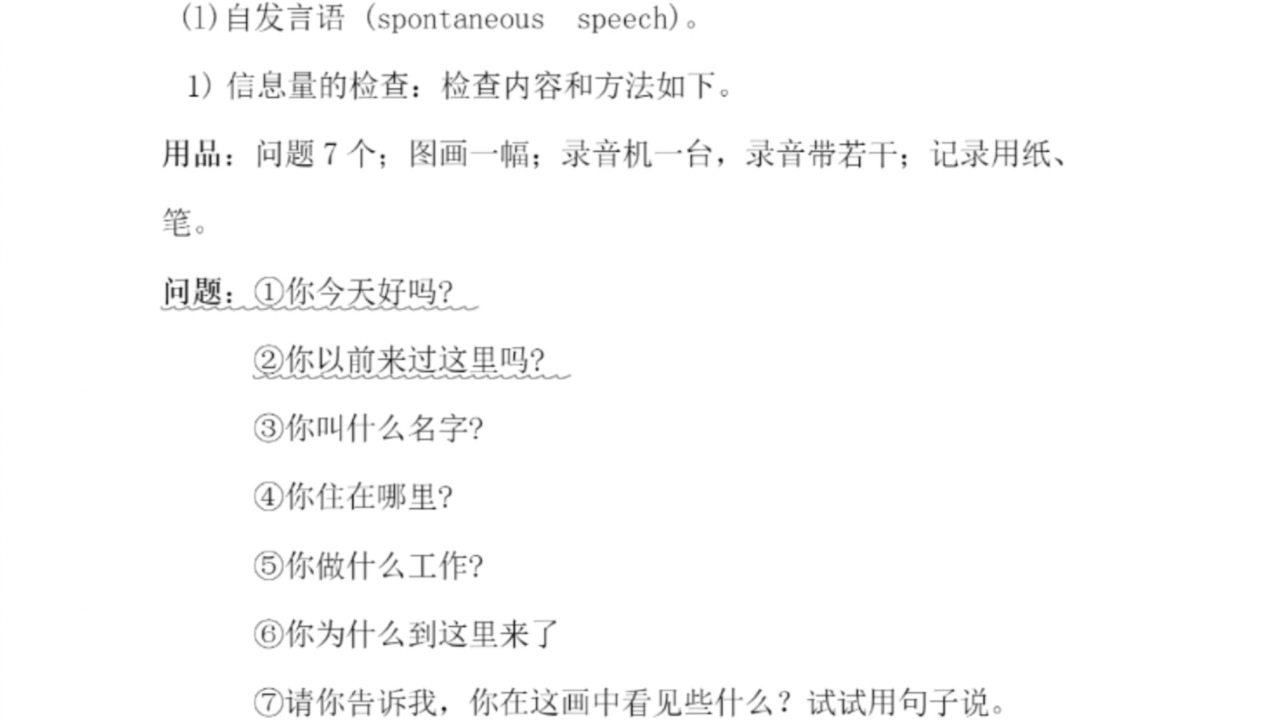 西方失语症成套测验是目前广泛用于失语症检查的方法之一,因其内容受语言和文化背景影响较小,稍做修改即可用于我国。其检查内容主要包括自发言语、听理解力检查、命名检查等项目。该检查适用于失语症的脑损伤患者,可计算出失语指数和大脑皮质指数,还可根据言语功能部分亚项的分数可以做出失语症的分类,但是目前尚无汉语使用者常模。