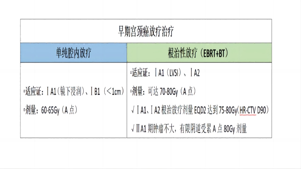放射治疗是不适合手术治疗的早期宫颈癌(ⅠA-ⅠB2、ⅡA1期)患者的治疗方式,但有保留生育要求,不考虑放疗。根据患者的肿瘤分期、选择不同的放疗方式:单纯腔内放疗、根治性放疗。研究显示,宫颈腺癌对放疗相对不敏感。