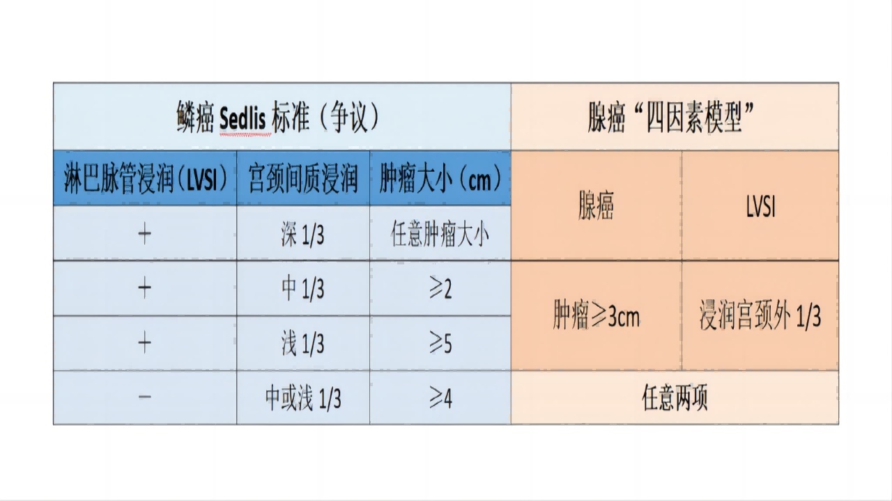 早期宫颈癌术后病理诊断决定术后补充治疗。高危因素包括淋巴结阳性、宫旁浸润、切缘阳性。鳞癌中危因素可参照Sedlis标准决定术后补充治疗,但目前还存在一些争议,腺癌中危因素参照“四因素模型”,但HPV相关型腺癌参照Silva分型可作为术后补充治疗的参考依据。