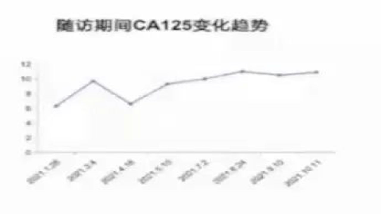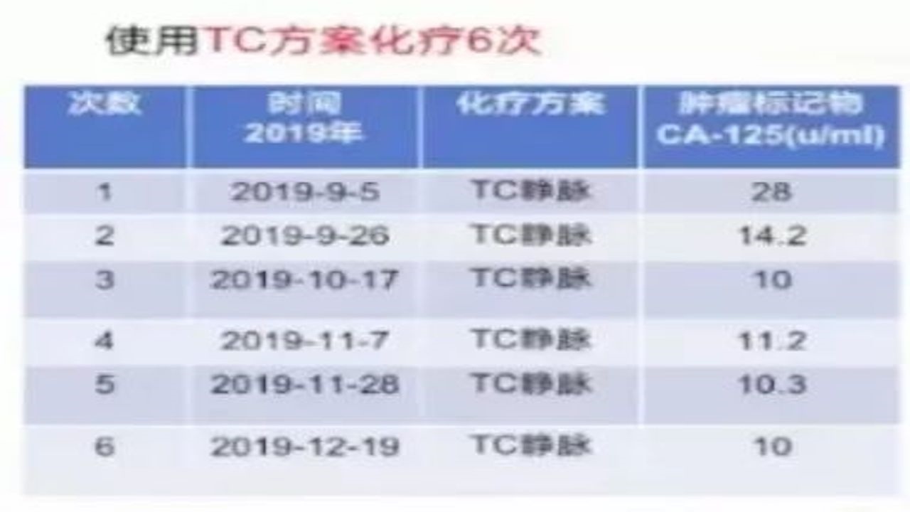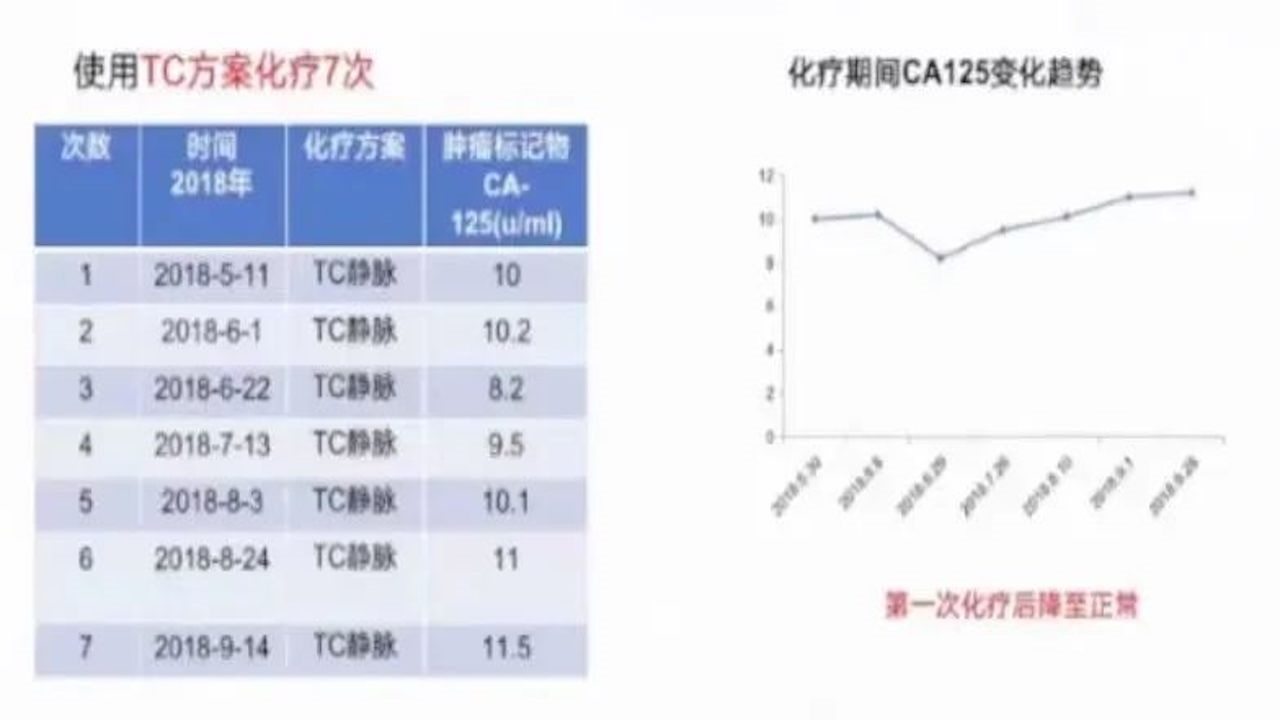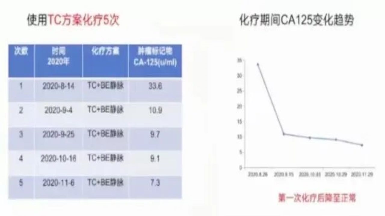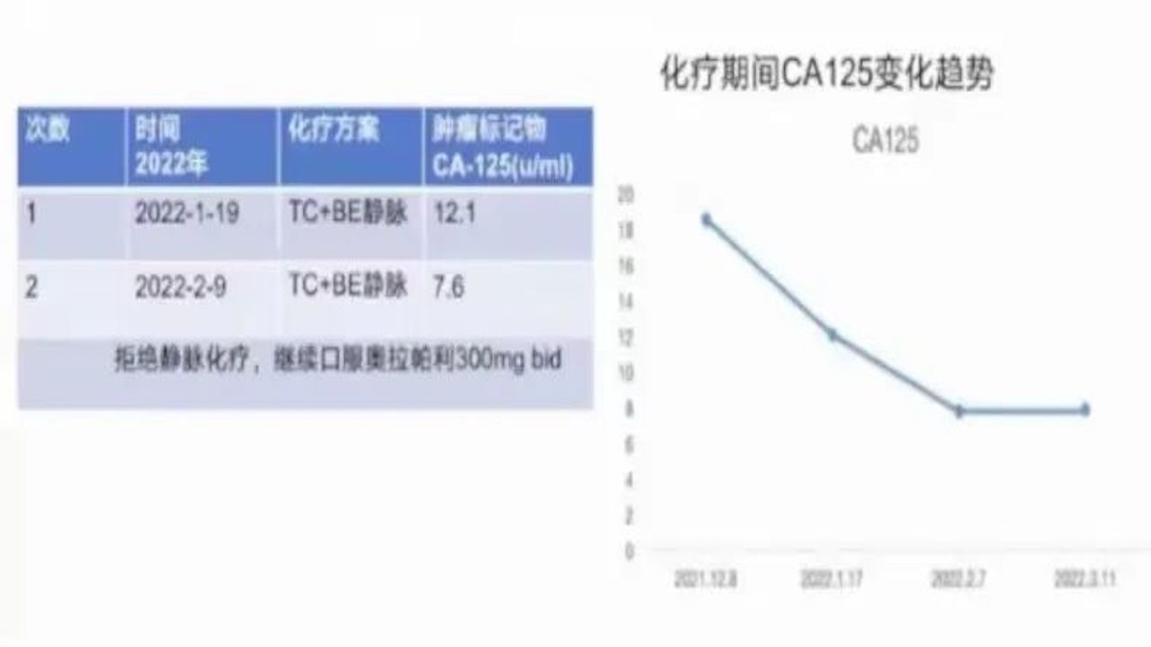 患者依然处于铂敏感期,TC方案化疗+抗血管生成药物治疗。第一次化疗后肿瘤标记物降至正常。