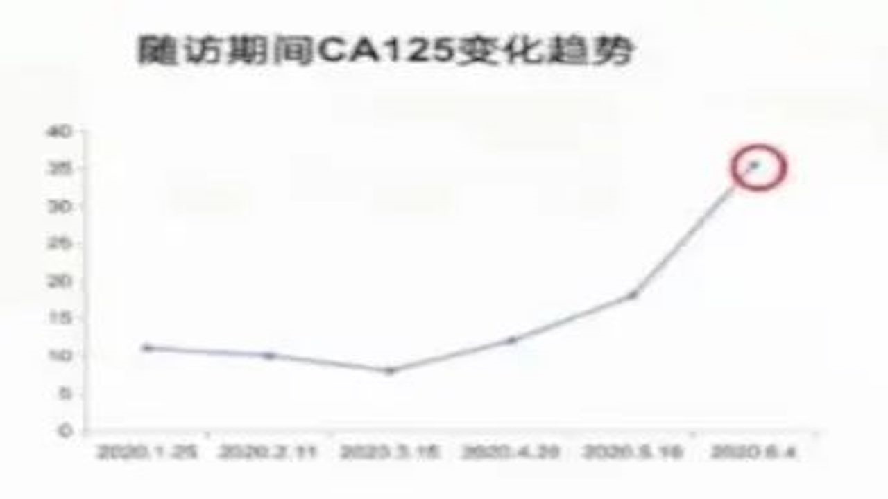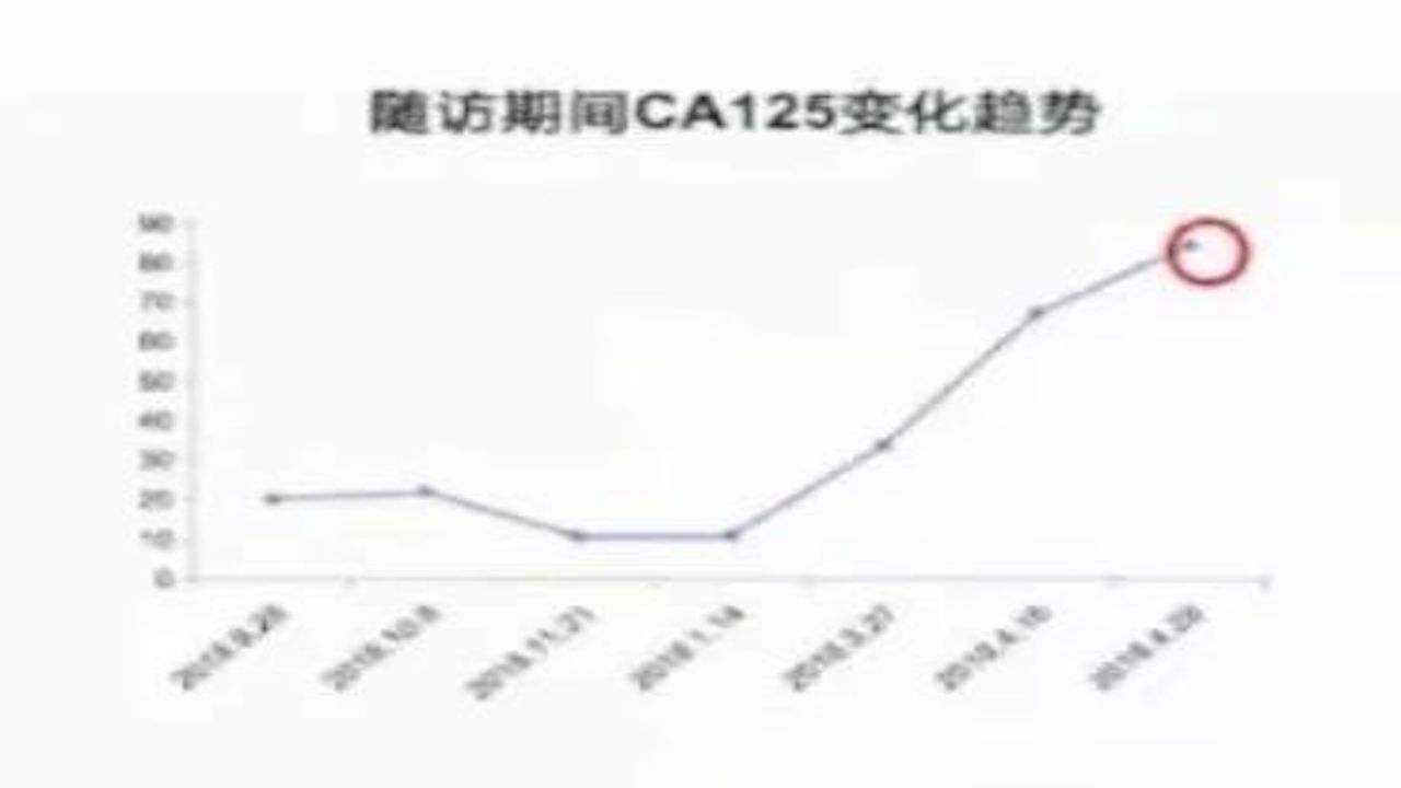 2018年8月至2019年4月规律随访。2019-94-28肿瘤标记物升高。
