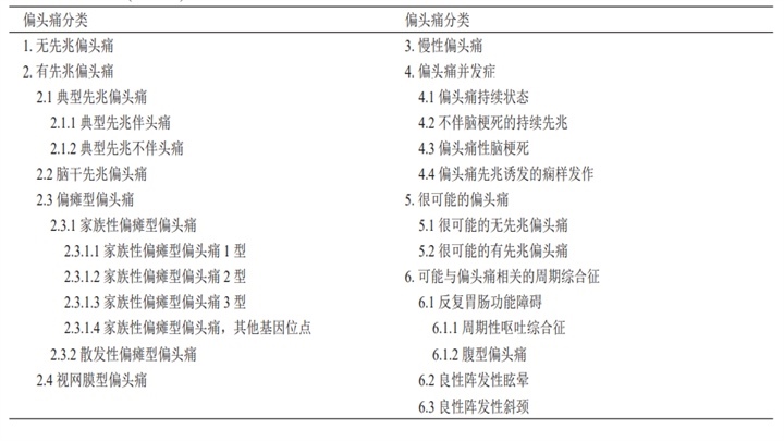 在第三版国际头痛疾病分类(TheInternationalClassificationofHeadacheDisorders,3rdedition,ICHD-3)中,偏头痛被分为6种亚型(见表1),常见类型详细诊断标准如下[1]。