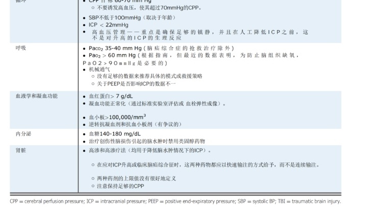 严重TBI的广泛系统效应使得有必要进行多器官系统管理,以减少继发性脑损伤。虽然最初的管理是围绕着大脑的特定目标,但预防和管理颅外器官功能障碍是临床上的优先事项。与严重脓毒症需要考虑多个器官系统类似,严重创伤性脑损伤的管理需要平衡优化通常相互竞争的管理策略。由于严重脓毒症的管理从源头控制开始,以防止初始损伤的进一步传播,严重创伤性脑损伤的管理从试图通过去除肿块病变和降低ICP来控制正在发生的脑损伤开始。维持足够的CBF对于防止继发性神经损伤和促进功能恢复是最重要的,当脑血管自动调节因创伤而改变时尤其重要。CBF在临床上很少以连续的方式直接测量;因此,脑灌注压(CPP)或平均动脉压-ICP被用作适当血流量的替代指标。现有的最佳证据和当代指南建议成人的CPP保持在60至70mmHg之间。
