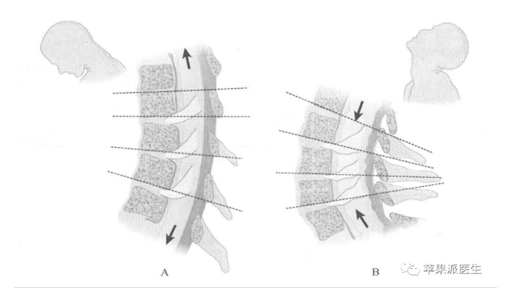 上图虚线显示了屈曲与后伸时颈椎角度的实际变化及伴随的神经根和脊髓的张力变化。A,为头部屈曲,B,为头部后伸。注意在图A中脊髓和神经根被牵拉并延长,在图B中松弛并打褶。