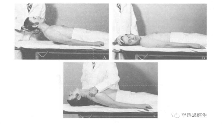 上图显示,真正的颈强直,提示脑膜刺激。A,颈部高度抵抗屈曲,常常可以达到检查者抬起患者的头部和脊柱像一座雕塑的程度;B,尽管高度颈强直抵抗屈曲,颈部可以自由旋转;C,检查者抬起患者肩膀时,头部轻松向后垂下。