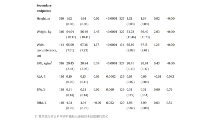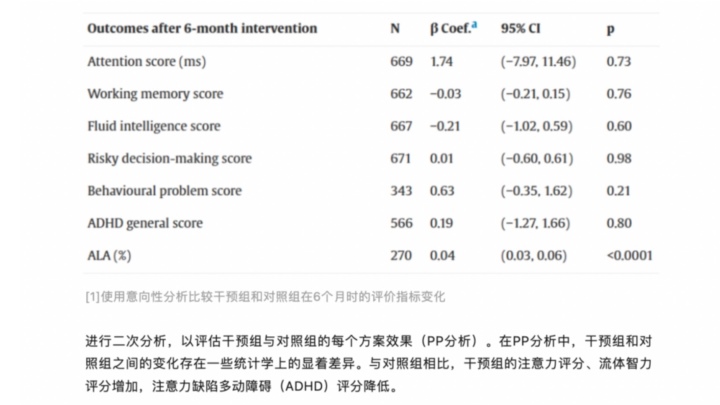 6个月后,组内评估发现两组参与者6个月后注意力功能,工作记忆,流体智力和风险决策得分显着增加。干预组的ω-6脂肪酸的红细胞比例(RBCALA)状态增加了0.03%,对照组增加了0.01%。两组间主要评价指标差异无统计学意义。