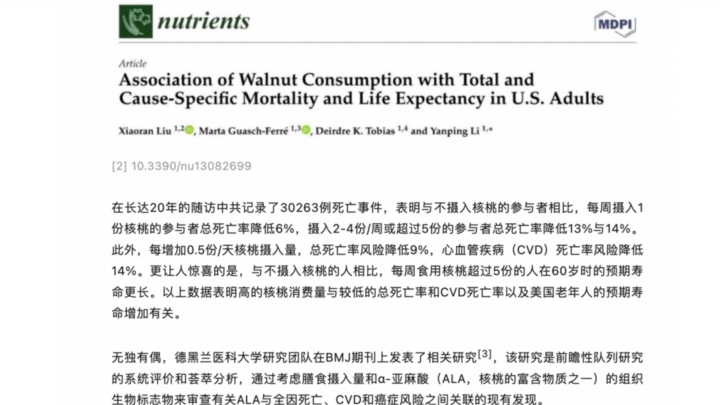 [2]LiuX,Guasch-FerréM,TobiasDK,LiY.AssociationofWalnutConsumptionwithTotalandCause-SpecificMortalityandLifeExpectancyinU.S.Adults.Nutrients.2021;13(8):2699.Published2021Aug4.doi:10.3390/nu13082699