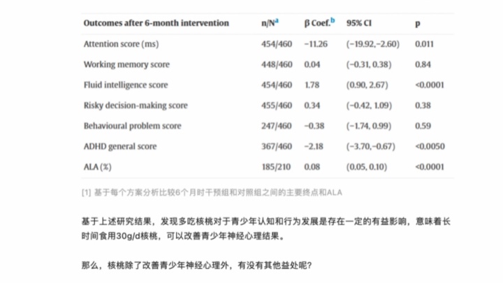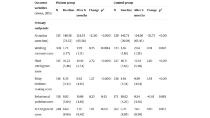 基于上述情况,研究人员为了更明确了解补充核桃与青少年神经心理的关系,排除了可能会影响结果的混杂因素带来的影响,发现6个月后,干预组和对照组检测到的主要评价指标变化没有明显差异,但干预组的RBCALA平均值高于对照组。