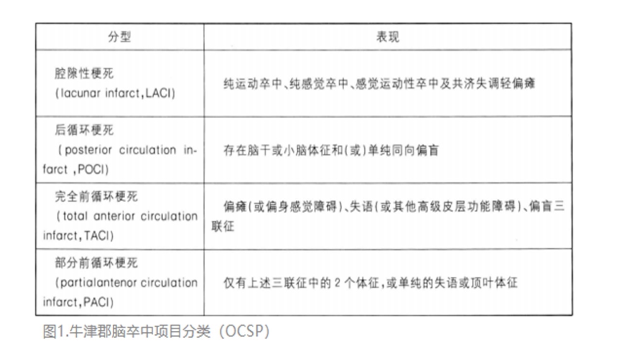 临床上缺血性脑卒中的分型方法较多,但比较而言,OCSP分型方法简便,无需复杂的检查设备,在中小型医院甚至在社区即能完成,可在发病急性期影像学检查尚无法充分显示梗死灶大小和部位的情况下迅速明确分型,以帮助临床医师选择治疗方案。