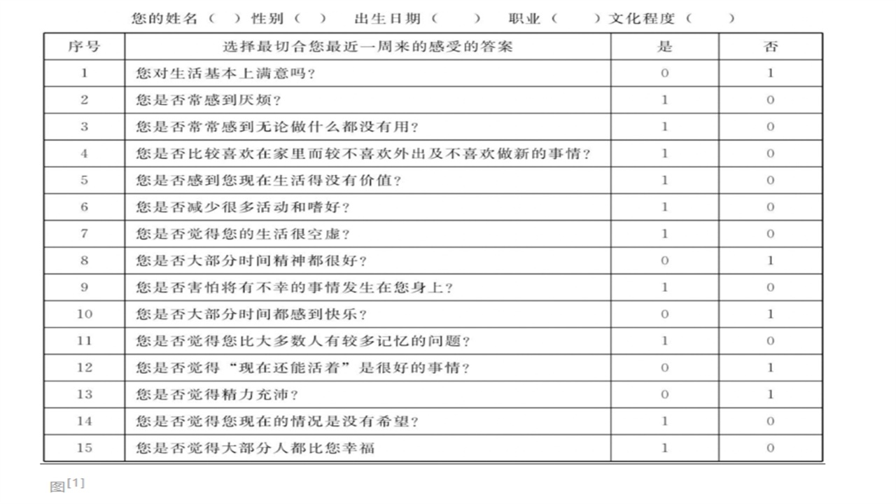 GDS-15包含15个问题,旨在了解老年人在过去一周内的心境和心理状态。这些问题主要涉及患者的心情、兴趣、体重、睡眠、疲劳、自责感、自杀倾向等方面。每个问题的回答选项是“是”或“否”。