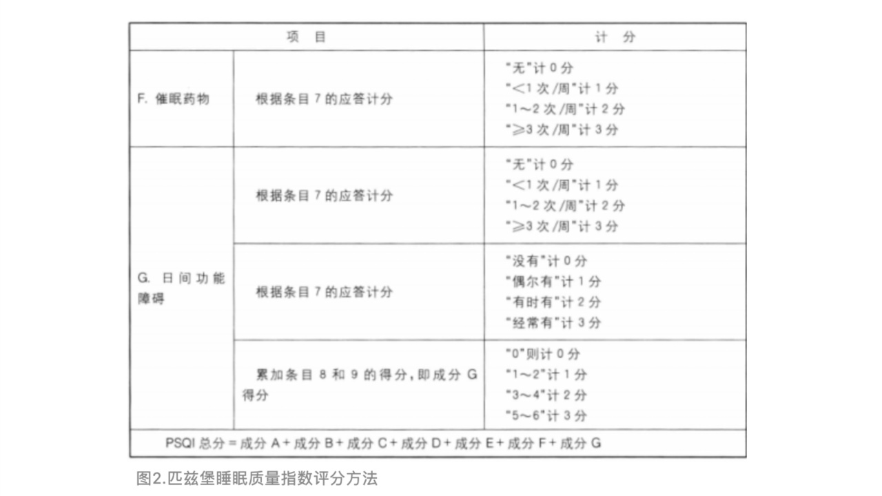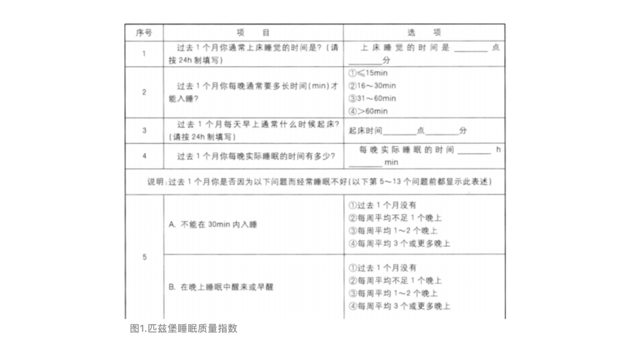 匹兹堡睡眠质量指数(图1)是美国匹兹堡大学精神科医师Buysse博士等人于1993年编制,该量表适用于睡眠障碍患者、精神障碍患者的睡眠质量评价,同时也适用于一般人睡眠质量的评估。