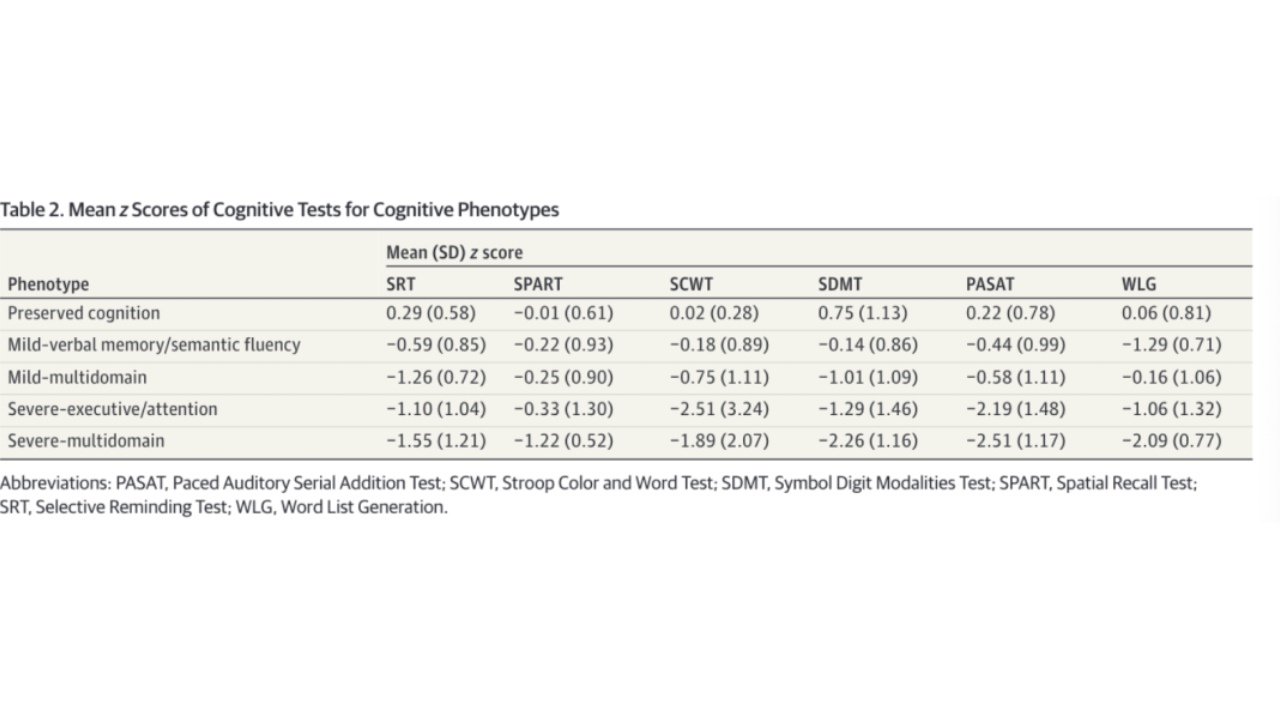 第四种分型,严重-多功能受损,在所有测试中表现下降,在PASAT和SCWT中损伤更严重。具有这种表型的患者可能在注意力和执行功能方面有严重的障碍,如认知干扰抑制。