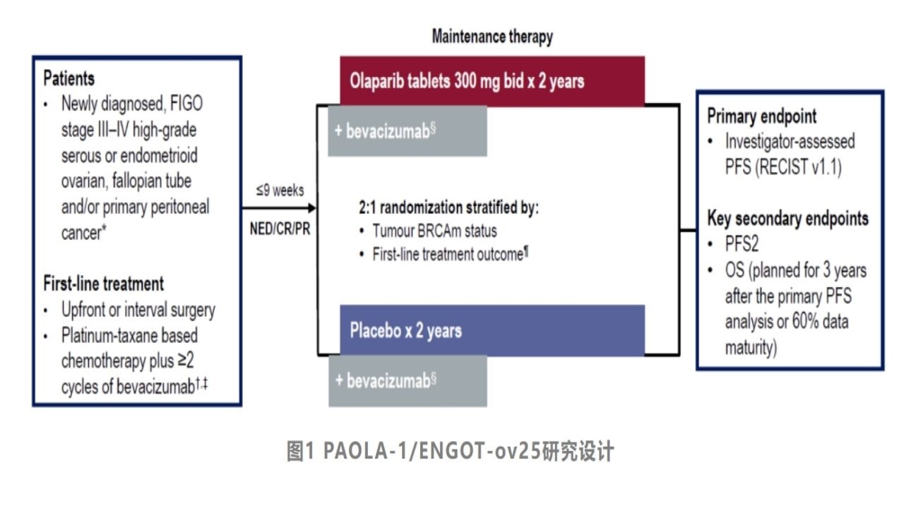 PAOLA-1/ENGOT-ov25是一项全球多中心、随机、双盲、Ⅲ期临床试验,纳入了806例新诊断的FIGO ⅢB~Ⅳ期高级别浆液性或子宫内膜样卵巢癌、输卵管或原发性腹膜癌,铂类化疗+贝伐珠单抗一线治疗后获完全或部分缓解(PR/CR)的患者(不论BRCA突变状态),2:1随机分配至接受奥拉帕利300mg bid+贝伐珠单抗15mg/kg q3w(N=537)或安慰剂+贝伐珠单抗(N=269)治疗,奥拉帕利或安慰剂的给药持续最长24个月,贝伐珠单抗给药持续15个月(图1)。