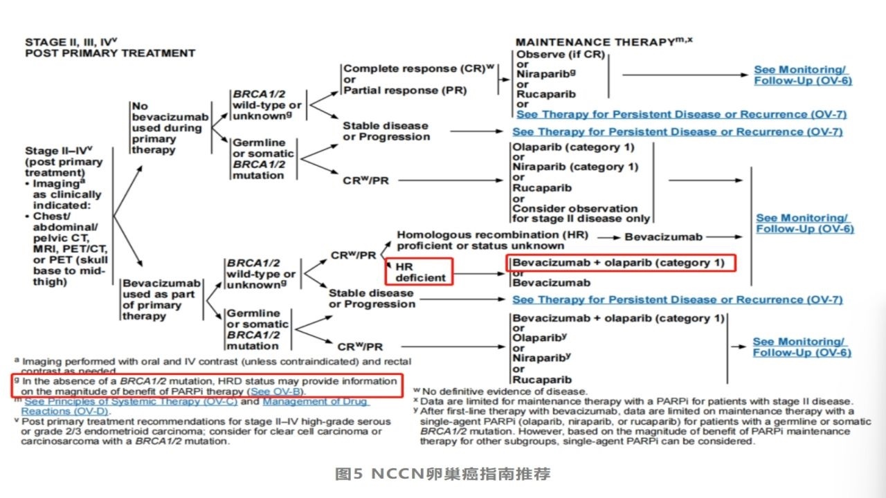 随后,PAOLA-1/ENGOT-ov25研究多次亮相国际会议,报道了亚组分析/探索性分析结果。2022年9月的ESMO年会上,PAOLA-1/ENGOT-ov25研究首次公布了OS结果,证实首次分析中奥拉帕利+贝伐珠单抗的PFS获益能够成功转化为对HRD阳性患者具有临床意义的OS获益,确立了该联合方案为这类HRD阳性患者的标准治疗之一。基于PAOLA-1/ENGOT-ov25研究最新的结果,NCCN指南对奥拉帕利联合贝伐珠单抗方案的推荐也愈加精准,2023版NCCN指南中:①支持新诊断卵巢癌非BRCAm的患者,检测HRD状态指导治疗方案的选择;②HRD阳性患者,奥拉帕利+贝伐珠单抗推荐等级由2A类修改为1类,③HRD阴性或HRD状态未知患者,推荐贝伐珠单抗单药(图5)。
