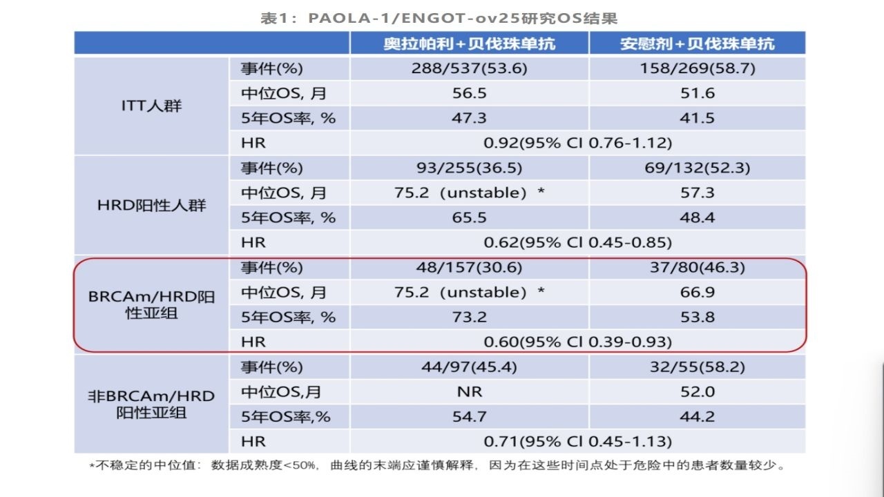 BRCAm/HRD阳性亚组:奥拉帕利+贝伐珠单抗组和安慰剂+贝伐珠单抗组的中位OS为75.2个月 vs 66.9个月(HR=0.60, 95CI 0.39~0.93),5年OS率为73.2% vs 53.8%。BRCAm/HRD阳性患者死亡风险降低达40%,5年生存率绝对提升19.4%。