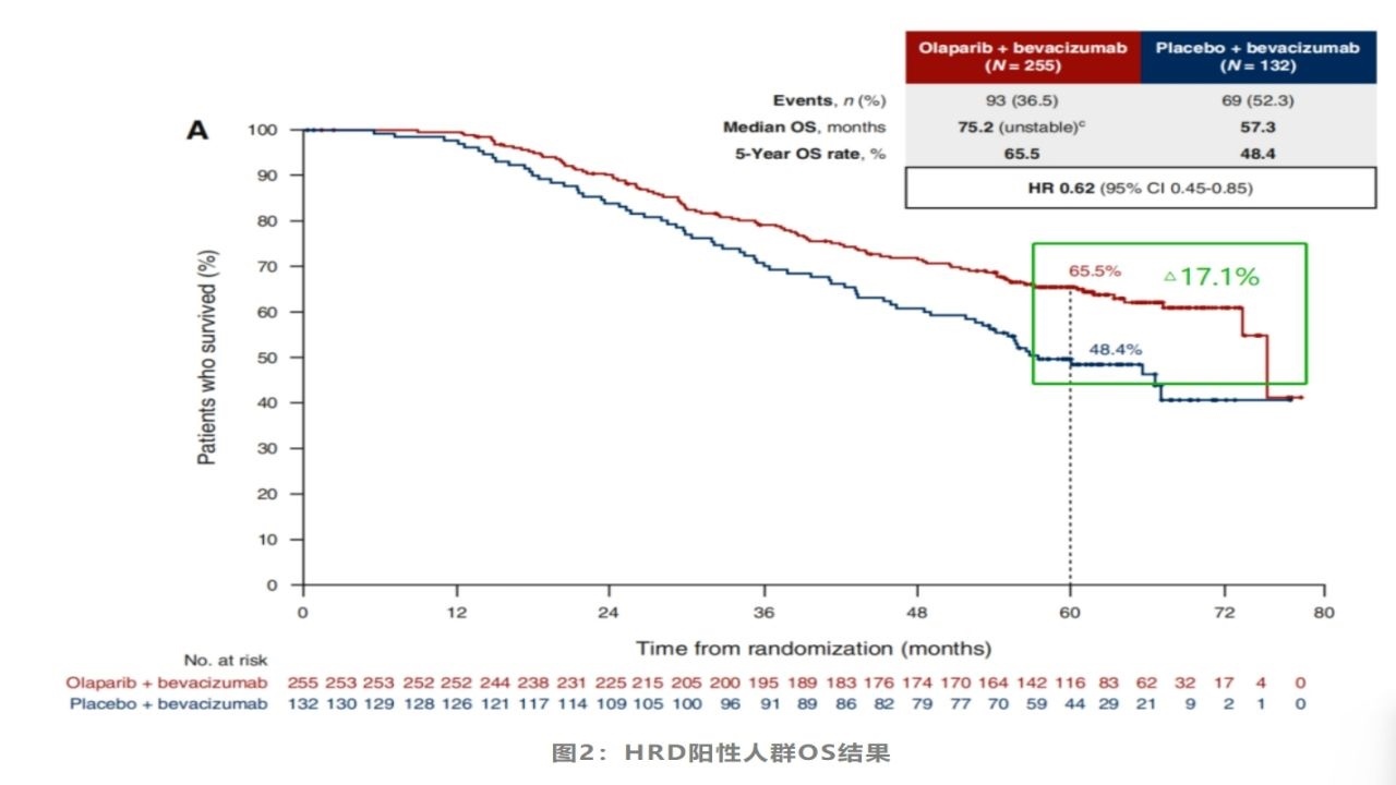 HRD阳性人群:奥拉帕利+贝伐珠单抗组和安慰剂+贝伐珠单抗组的中位OS为75.2个月 vs 57.3个月(HR=0.62, 95CI 0.45~0.85),5年OS率为65.5% vs 48.4%(图2)。在后续治疗中,奥拉帕利组中17.3%和安慰剂组50.8%的患者接受了PARP抑制剂治疗。