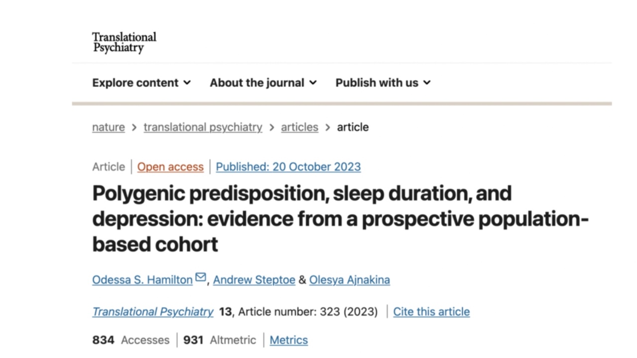 Odessa S.Hamilton,Andrew Steptoe,Olesya Ajnakina.Polygenic predisposition,sleep duration,anddepression:evidence from a prospective population-based cohort.Translational Psychiatry,2023;13(1)DOI:10.1038/s41398-023-02622-z