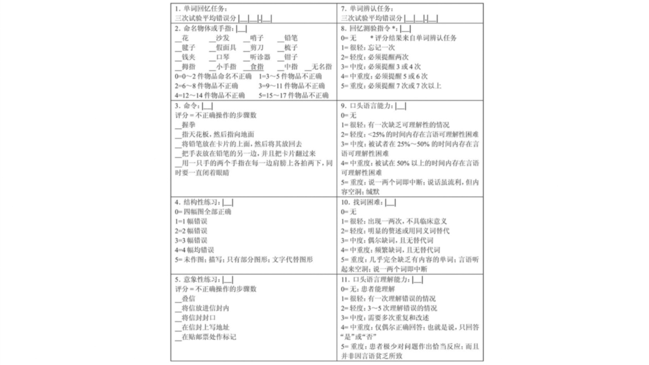 包括12个条目,其中4个评估记忆(单词回忆和单词辨认)和定向力(时间和地点),5个评估语言(物体或手指命名、指令、口头语言能力、找词困难和口头语言理解能力),2个评估实践能力(结构性练习和意象性练习),1个评估注意力和注意力集中(回忆测验指令)。评分范围从0分(无错误或损害)到最大值70分(所有测验条目中表现出严重损害)。