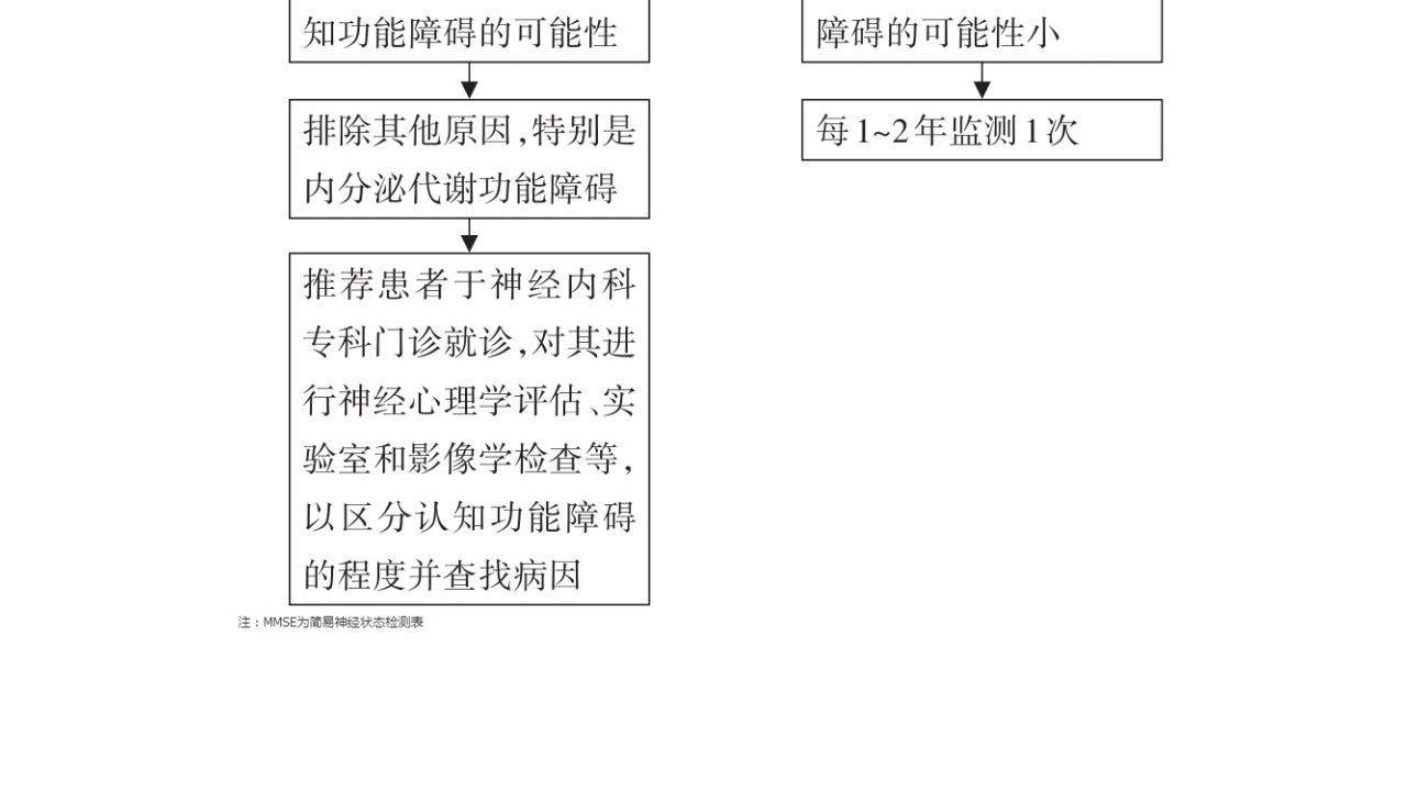对糖尿病患者的认知功能障碍评估包括详细的病史询问和检查等项目。如评估为认知障碍低风险,则应每1~2年持续监测;如为高风险,则需进行简短的神经心理学测试。若评估提示有较高的认知功能障碍的可能性,需请神经内科专家进一步进行神经心理学评估、实验室和影像学检查等以最终确诊。与此同时,排除并治疗常见的可逆性认知功能障碍也很重要,包括谵妄、药物不良反应、代谢或内分泌异常、睡眠障碍和抑郁症等[5],诊断流程见图1。