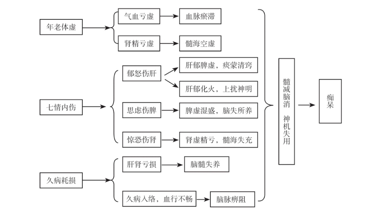 痴呆的形成主要受到内在因素的影响,通常是由于年龄增长导致身体虚弱、七情内伤、长期慢性病等原因引起的气血不足、肾精亏耗,进而导致脑髓失去养分。或者是由于气滞、痰浊、血瘀在脑络中阻塞,引起神经通路的异常。病机的核心在于髓减脑消,神机失灵。与心、肝、脾、肾等脏器功能的失调密切相关,尤其是与肾虚的关系紧密。肾精不足或气血亏虚会导致髓海失充、脑脉失养,同样,痰瘀实邪也可能导致脑络受阻,清窍失养,从而引发痴呆。
