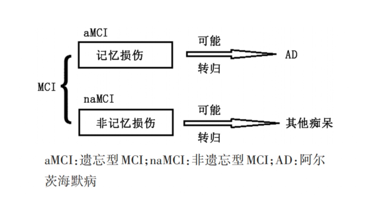 MCI通常分为两大亚型:遗忘型MCI(aMCI)和非遗忘型MCI(naMCI)。aMCI主要表现为明显的记忆功能损伤;而naMCI主要表现为其他认知功能损伤,如注意力、语言、视觉空间功能或执行功能损伤。aMCI很可能会进展为AD,但并不完全等同于AD源性MCI,naMCI可能会进展为其他类型痴呆,如血管型痴呆、额颞叶痴呆等[1]。