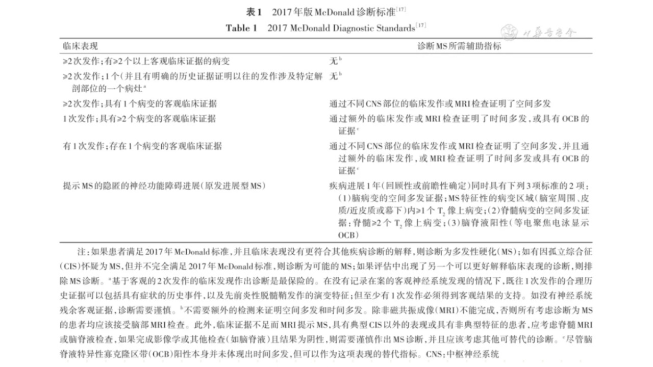 MS的诊断遵循2017版McDonald诊断标准(表1)。