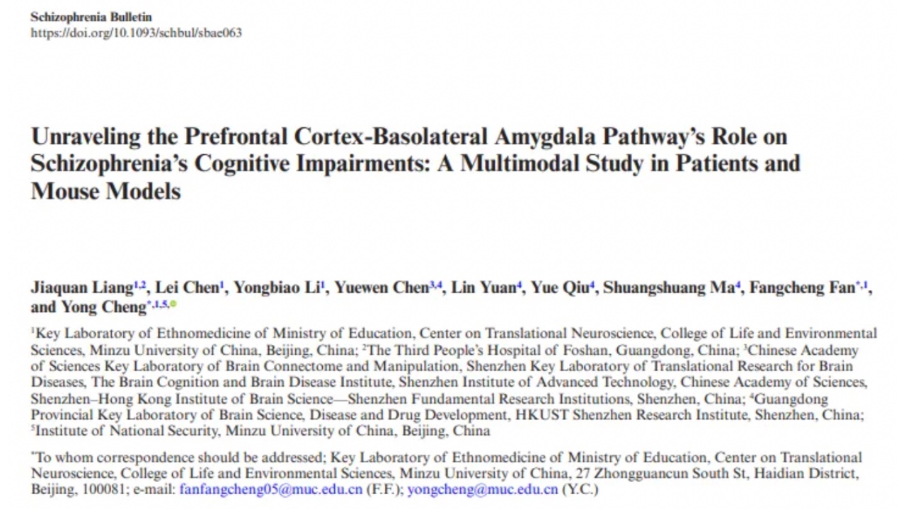 中央民族大学程勇教授团队近日在《SchizophreniaBulletin》期刊上发表了一篇题为“UnravelingthePFC-BLAPathway'sRoleonSchizophrenia’sCognitiveImpairments:AMulti-ModalStudyinPatientsandMouseModels”的研究论文,揭示了前额叶皮层(PFC)与基底杏仁核(BLA)通路在精神分裂症(SCZ)认知障碍中的关键作用。这一发现为未来的诊断和治疗提供了新的方向。