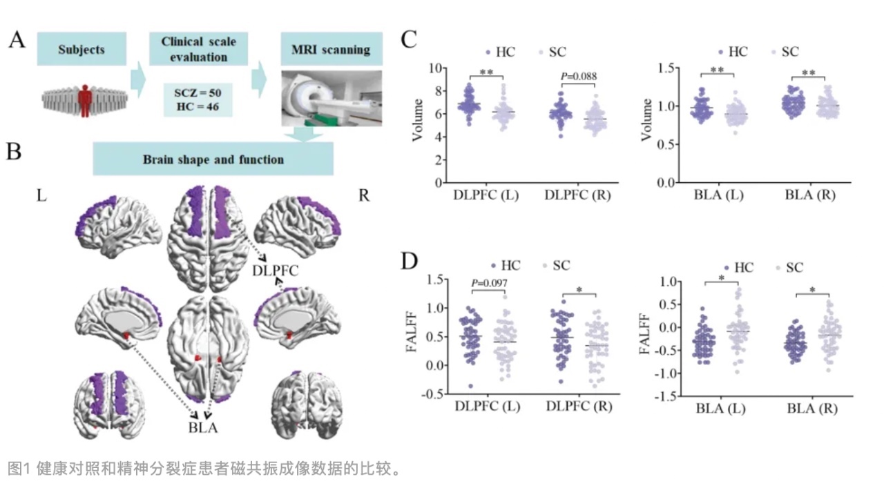 程勇教授团队的研究重点是前额叶皮层(PFC)和基底杏仁核(BLA)之间的神经通路对精神分裂症认知障碍的影响。PFC在认知处理、情绪调节和社会行为中扮演着关键角色,而BLA在情绪反应和记忆过程中起重要作用。研究人员通过多种先进技术,包括临床量表、磁共振成像(MRI)、单细胞测序和光遗传学,对SCZ过程中的PFC-BLA通路进行了全面研究。研究结果显示,SCZ患者与健康对照组在脑体积和神经活动方面存在显著差异,特别是在背外侧前额叶皮质(DLPFC)和BLA区域。具体来说,DLPFC和BLA区域的体积减少与患者认知功能评分的降低密切相关。这些发现为理解精神分裂症的病理机制提供了新的视角。