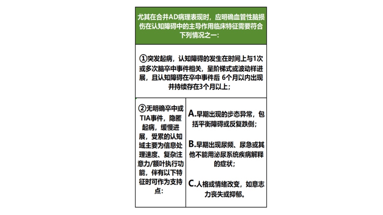 (3)血管性脑损伤在认知障碍中占主导地位:尤其在合并AD病理表现时,应明确血管性脑损伤在认知障碍中的主导作用,需要符合以下的临床特征之一(详细特征请看表2)。