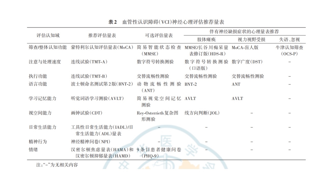 (1)VCI的影像评估:神经影像是VCI风险预测、病因病理诊断及预后评估的重要方法之一。头颅MRI在识别脑血管性损伤、鉴别认知障碍病因方面被视为VCI影像诊断的“金标准”。CT仅在患者存在MRI禁忌或因条件限制不能开展MRI的情况下推荐作为VCI辅助诊断工具。